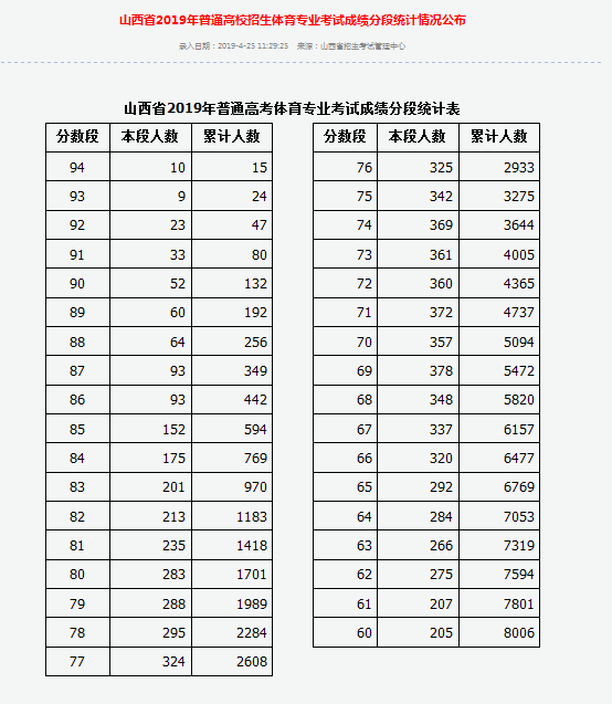 山西省2019年普通高校招生体育专业考试成绩分段统