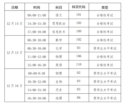 我区2022年下半年普通高中学业水平考试定于12月14日至16日举行。其中,普通高中学业水平合格性考试(以下简称合格性考试),开考语文、数学、英语、思想政治、物理、信息技术等6门科目,报考对象主要为高中二年级学生;高考综合改革前实施的原普通高中学业水平考试(以下简称原学业水平考试),开考物理、化学、生物、历史、地理等5门科目,报考对象主要为需要补考相应科目的高中三年级学生。考试方式均为笔试,实行试卷和答题卡分离模式,具体考试时间安排如下:
