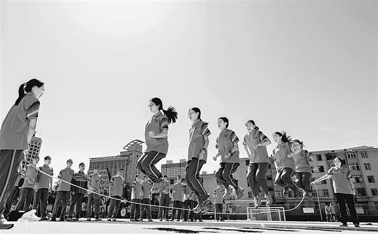 甘肃省张掖育才中学“向美而生,从心出发”心理健康主题教育活动中,学生在进行跳长绳活动。杨潇摄/光明图片