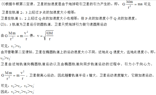 ⑵设卫星在轨道1、3上的速度大小为v1、v3 ,在椭圆轨道上Q、P点的速度大小分别是,比较四个速度的大小 ?