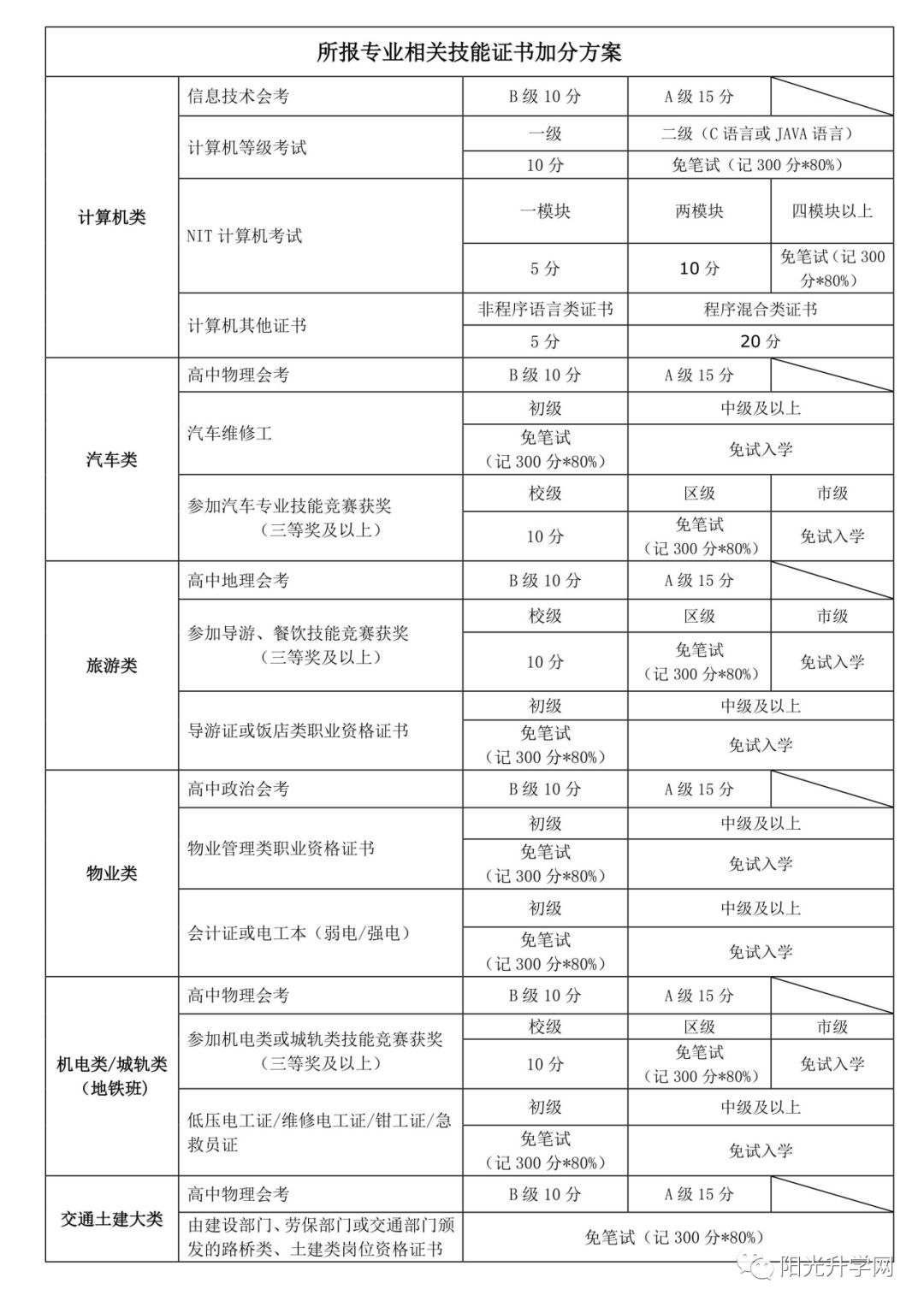 2、面试:以面试形式进行,学院根据招生专业特点和要求组织面试考核(满分100分)。主要考察考生观察、分析及解决问题的能力;考察考生的基本专业知识、职业素养和学习潜能。对考生在掌握综合知识,讲究文明礼貌等方面进行综合考察。 3、特长成绩:指中职考生在高中阶段获得相关专业的职业资格证书;高中考生会考级别达到相应加分等级;中职或高中考生获得校级三好学生/优秀学生干部/优秀团员/政府奖学金称号之一的,或校级学科竞赛类获奖者;体育类、文艺类、人文科普类等方面获得一定级别的等级证书或在省市比赛中获奖等。最高30分。